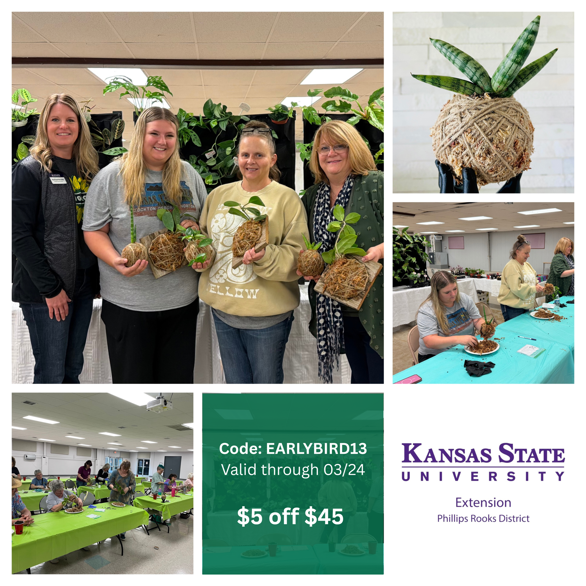 Come and treat yourself to a class of GREENERY @ Rooks County Fairgrounds, 4-H Building (918 S Elm St, Stockton, KS 67669). You have the option of creating a wall mounted art or learning how to make a Kokedama, which means "moss ball" in Japanese. Walk away with your own garden art creation that will make for a unique personalized gift or addition to your home and garden décor.