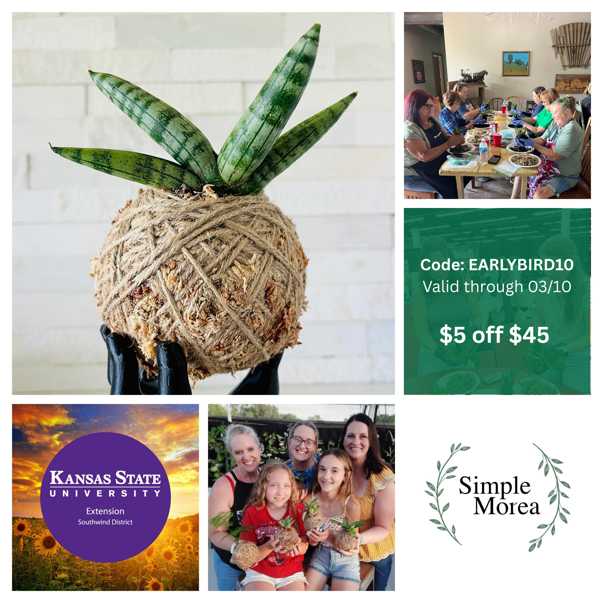 Come and treat yourself to a class of GREENERY @ Southwind Extension District - Iola Office (1006 N. State St., Iola, KS 66749). Kokedama means "moss ball" in Japanese. Walk away with your own garden art creation that will make for a unique personalized gift or addition to your home and garden décor.